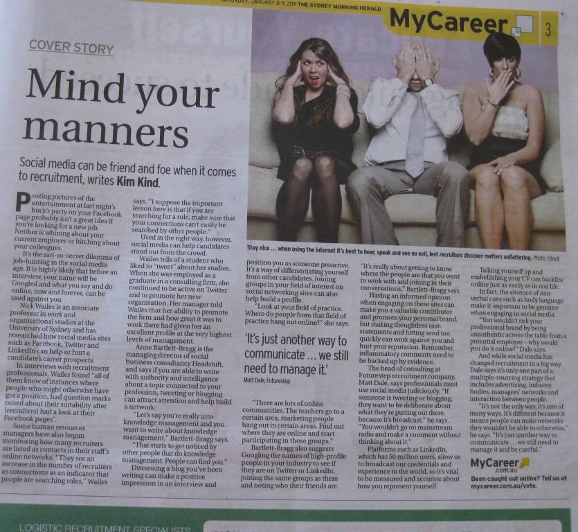 In the SMH | My Career section in yesterday’s edition there was a great article called ‘Mind your manners’ by Kim Kind. She writes that when social media is used in the right way it can help candidates stand out from the crowd. Here are a few points from the article: