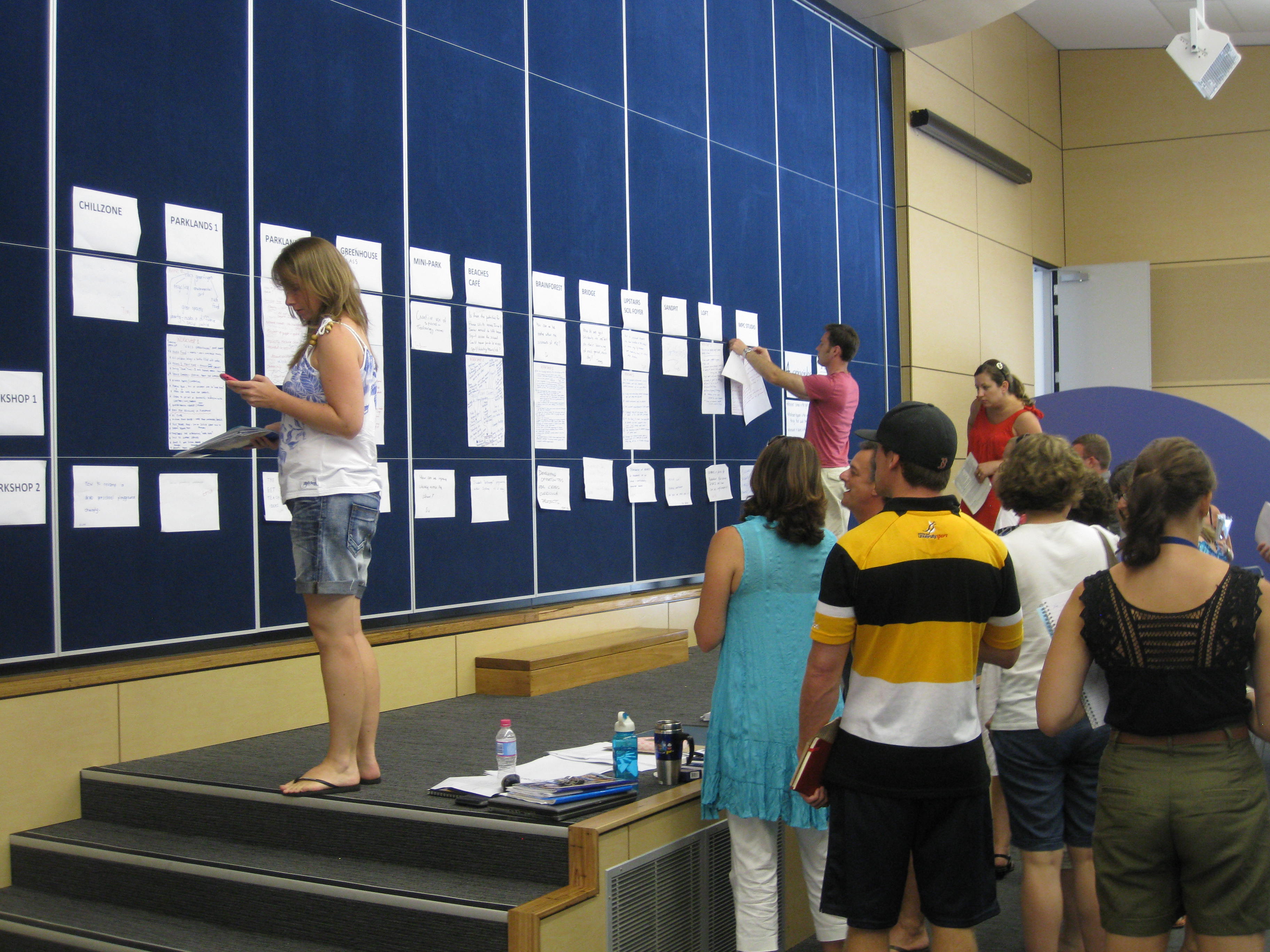 Any participant can choose to facilitate a discussion around a topic which is briefly presented to the group and posted on the ‘Marketplace’. Venues are assigned to each workshop and the participants peruse the marketplace to see which discussion will interest them in the workshop sessions.