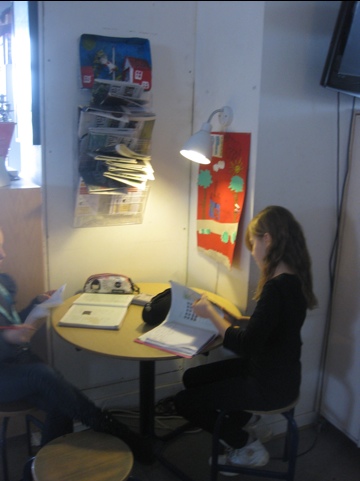 Two of the class groups were in their instruction space with their teacher, the others were choosing where to work – in the nook, at the kitchen table or on the sofa, with their feet on the coffee table. The size and furnishing of the instructions spaces discourages classes from being in their too long, the round tables with stools are just for that particular type of work.
