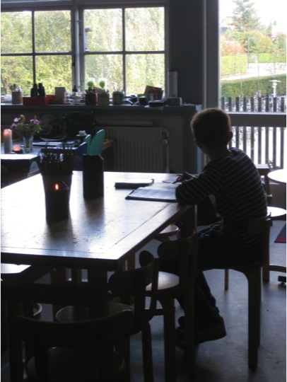 The teacher brought the young boy over to the kitchen, took a plate, put some crackers with cheese together for him and then sat at the ‘kitchen table’ to work with him on his maths problems.