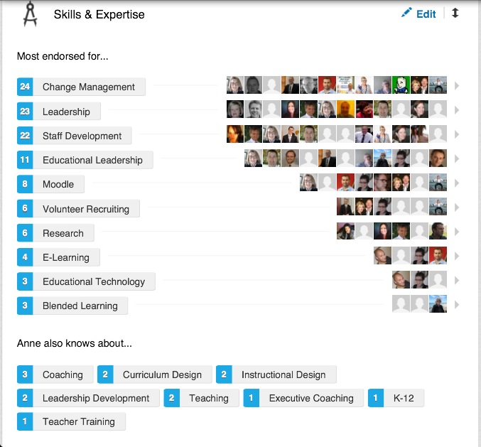 I’m happy with Change Management being the most endorsed skill (Did I say thanks?) as that is probably one of the most common themes in my communication, along with Leadership. From there, Staff Development and Educational Leadership also fit, as I want to see people grow and encourage change in schools.