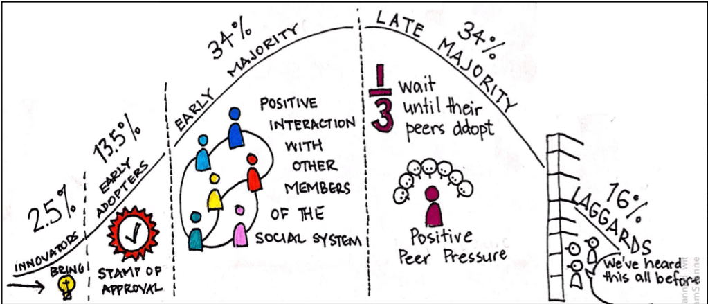The theory of ‘diffusion of innovations’ was developed by Everitt Rogers in 1962. It is one of the oldest social science theories, explaining how people respond to change, and aiming to increase the rate of adoption, while reducing uncertainty.