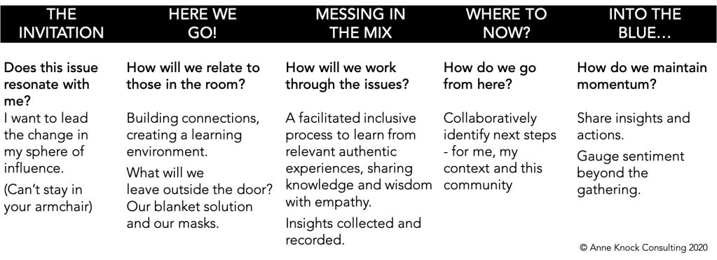 The skill of the facilitator is to shape the group dynamics and the conversation, to create an inclusive learning environment where people can think, dream, argue, trust and connect. The role begins before the event to meaningfully scaffold the purpose, and can continues beyond.