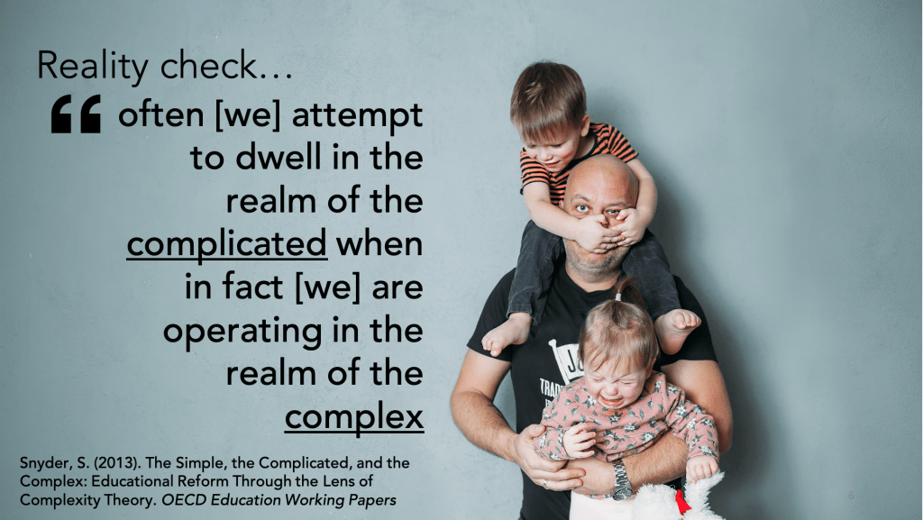 Complexity theory functions as an adaptive system, like ants in an any colony. Through their complex interactions and feedback loops, agents (the people in our communities) work out a way forward, through trial-and-error. Agents collaborate to prototype and test, they respond to feedback. Fresh innovation and creativity emerge from grassroots interactions, which is less likely to be achieved by top-down directives.