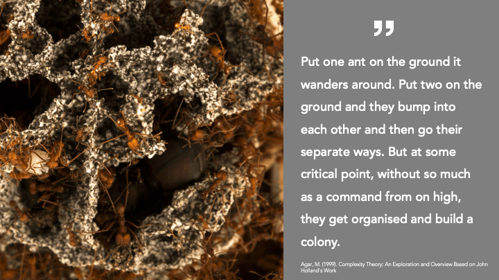 The metaphor commonly ascribed to complexity is that of the ant. Over the last six months, I probably have learnt more about ants than in my entire life. I’ve discovered that ants are fascinating. Ants are an example of bottom-up systems, not top down. They embody complex adaptive systems that display emergent behaviour.