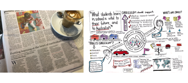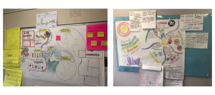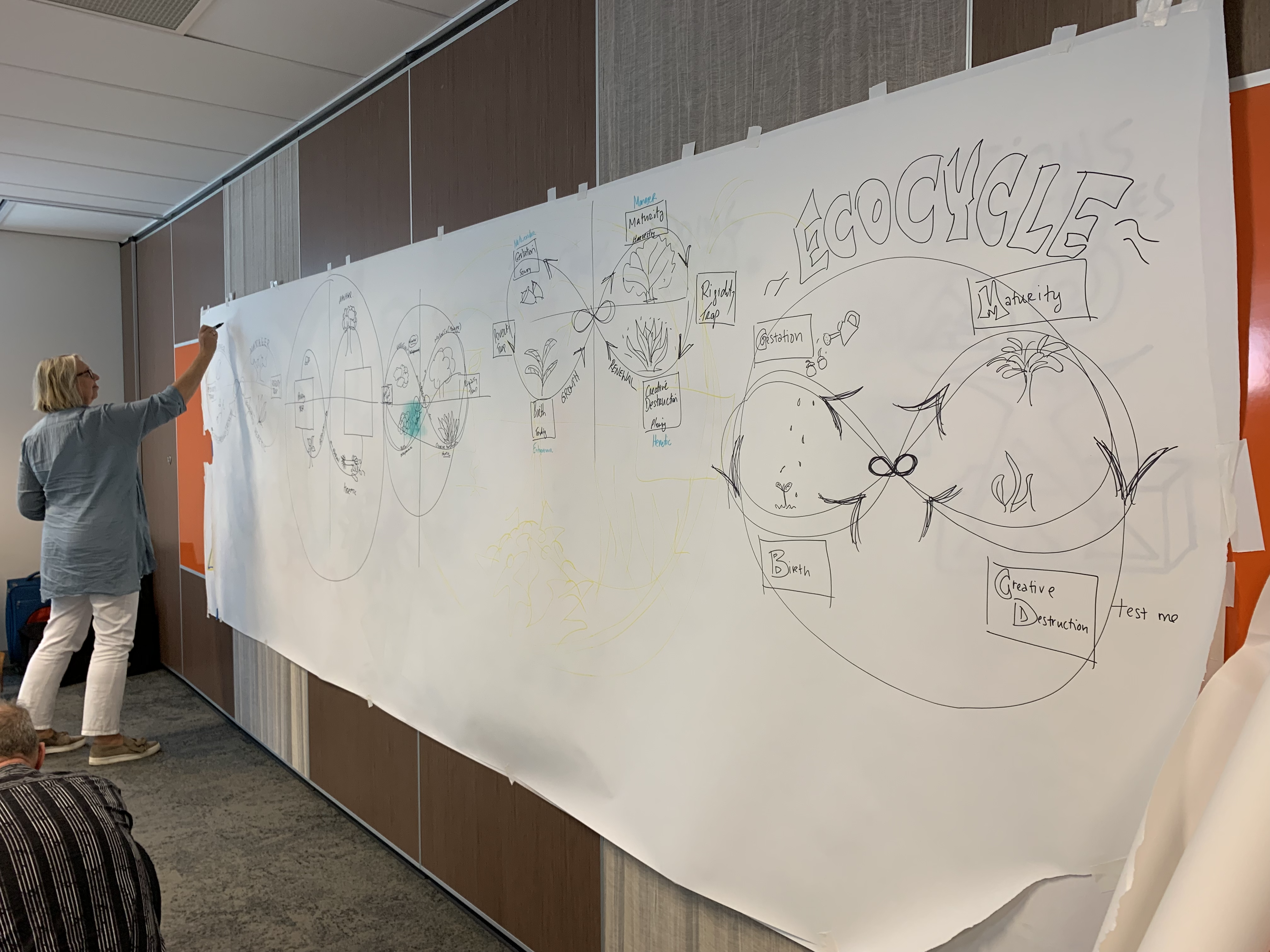 In early February 2019, I attended a workshop for facilitators using tools called Liberating Structures. The tools themselves have revolutionised my practice. Throughout the workshop co-developer/ lead facilitator, Keith McCandless, would set us up for a dialogue or an activity and then while we were engaged, he would work on the ongoing visualisation of the three day workshop. This left us to our own dialogue and ideas, without the ‘hovering facilitator’ nearby. On the last day, there was an option to learn about and have-a-go graphic visualising, so I leapt in. (Read more in a recent blog post)